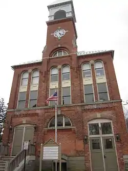 Fireman's Hall is a historic fire hall located at Alfred in Allegany County, New York. It was built in 1890-1891 by volunteer firemen as the first home of the A.E. Crandall Hook & Ladder Co. It is a massive three story brick and sandstone structure that features an imposing bell / clock tower. The clock, designed by Seth Thomas, was donated by the Samuel Stillman family after the Village ran out of funds for the hall.[2] The weather vane atop depicts a firefighter on a ladder. The building has housed village offices since the 1970s, as well as village court, police station and meeting hall today.[3]