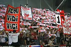Beginning of the 1990s the away games were attended in great numbers. The Vojvodina fans drove to Sarajevo, Banja Luka, Belgrade, Skopje, Split, Subotica, Podgorica (former Titograd), Zrenjanin and other cities. But the deterioration of the politic situation in Yugoslavia, the following wars (1991–1995), the inflation and the UN sanctions have hit the state and his population hard. Stagnation was present in all Yugoslav supporter groups and in the Red Firm as well. In 1992, the Red Firm fell apart. Some of the subgroups tried to persist and to reestablish the image of Red Firm. The most persistent and the most organized group among them was the Firma. The crisis of several years were overcome and a new beginning of support started.[12] In 1994, decided a group of older fans of Vojvodina, better known by their nickname "Slaninari" (roughly translates: Bacon Boys), to form their own organized supporter group. The group was named Stara Garda (English: Old Guard). Immediately they started to collect voluntary contributions to finance the first flag of 10 meters which is still visible today.[13] In 1998, Vojvodina played the UEFA Intertoto Cup final against Werder Bremen. In the second leg Vojvodina played in front of 16,000 enthusiastic spectators. The supporter created a choreography, used flags and other stuff to be used during support. Such an exciting atmosphere was not seen for a long time in Novi Sad.[14] In the 1990s many fans visited also volleyball games. In 1996, when Sisley from Italy (then the champion of Europe) came to Novi Sad to play against OK Vojvodina, there were about 9,000-10,000 Vojvodina fans in the SPENS Sports Center hall, including about 3,000 Firmaši.[15]