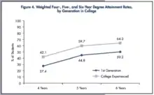 DeAngelo[72] provides statistics on graduation rates among FGCS and non-FGCS in a framework of four, five, and six years as well as a table that breaks down the degree attainment by race/ethnicity. These images from the study provide a breakdown, and show the huge gaps in degree attainment.[72] A new study revealed that only 27 percent of first-generation students will earn a bachelor's degree within four years of entering college, lagging far behind their continuing-generation peers.[73]