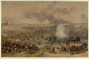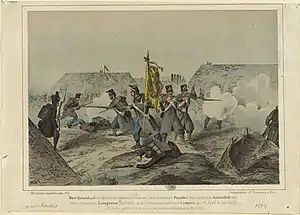 With this the Hungarians managed to halt the powerful imperial advance on their left wing, so the battle here continued as an artillery duel until they ran out of cannonballs.[39] One of the adjutants of the Hungarian headquarters, Kálmán Rochlitz, wrote in his memoirs: "Our field artillery ran out of ammunition so that when I went to one of the batteries of I corps, I saw with my own eyes how our artillerymen picked up from the ground the cannon balls fired at us [by the enemy], wadded them with rags made of clothes ripped from the dead bodies of the fallen [soldiers], and in this way, they loaded them into the gun barrels on top of the loose gunpowder they had put in first [in the cannon tubes]."[40]