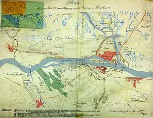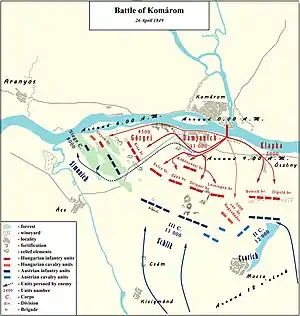 On 20 April, the Hungarian I and III Corps started their march towards Komárom.[18] On 22 April, the two Hungarian corps reached Komárom, breaking the northern section of the imperial blockade around the fortress.[19] On the same day, the garrison of Komárom broke out from the Nádor defense line against Sossay's brigade on the Csallóköz, forcing the imperials to retreat to Csallóközaranyos, then to Nyárasd.[19] The imperials lost 50 men and 30 horses,[19] losing also the connection with the Austrian siege corps from the right bank of the Danube, as the result of the fact that the Hungarian sortie troops, under the command of General János Lenkey, destroyed the bridge from Lovad across the Danube.[20] Hearing that Lieutenant General Wohlgemuth, who had retreated west of the river Vág, after his defeat at Nagysalló, was now advancing east again towards Érsekújvár, Görgei ordered the newly arrived VII Corps to deploy at Perbete, to secure the rear of the Hungarian army against possible attack.[19] The rest of the Hungarian corps were waiting the raft bridge over the Danube to be finished, which after intense work, was finished in the night of 25 to 26 April.[20]