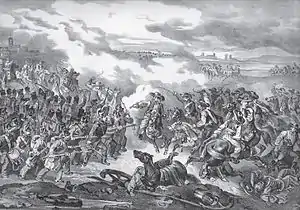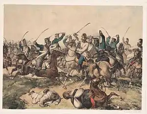 On the left wing, Nagysándor's 16 hussar companies and the uhlans of the Polish Legion companies, which pursued the Liebler brigade, advanced on the Ószőny-Nagyigmánd road, wanting to attack Schlik's troops from the right and back.[20] Schlik sent against them the concentrated cavalry of Lieutenant General Franz Liechtenstein, the Nicholas dragoons, and the Civalart uhlans, supported by a Congreve rocket battery. The two cavalry masses clashed southeast from the Csém grange.[20] In the first attack participated from the Austrian side, the Kisslinger dragoon brigade and the rocket battery, while from the Hungarian side the 2. and 3. hussar regiments and the Polish uhlans, at the end of which the hussars, also attacked by the cannons of the Austrian artillery, were forced to retreat. Now the second line of the Hungarian cavalry, represented by the 3. Hussar regiment, led by Colonel Kászonyi, intending to stop at least the pursuit of the Kisslinger brigade, charged, being joined also by the hussars of the first line, which earlier retreated, but now regrouped themselves along the Mocsa-Ács road, but at this moment the Austrian Montenuovo cavalry brigade appeared from the direction of Mocsa, and attacked with the greatest vigor the hussars on their right flank, causing them to rout.[20] The Austrian cavalry then attacked the 47. Honvéd battalion, scattering them, almost capturing the twelve-pounder battery. Luckily the 26. Honvéd battalion led by Major Beöthy came to their rescue, first firing several times, then carrying out a bayonet charge against the enemy cavalry, saving the 47. Honvéd battalion from their hopeless situation, and when Klapka ordered the Hungarian cannoneers near to them to shoot in the Austrian cavalry, Kisslinger was forced to retreat his order a retreat to his tired riders.[20]