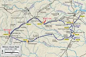 In June 1864, a Union division under the command of Brig. Gen. August V. Kautz moved into southern Virginia where they began destroying sections of the Wilmington and Weldon Railroad as part of the Richmond-Petersburg Campaign. On June 29 the division reached Ream's Station south of Petersburg on the Weldon Railroad, which was thought to be held by Union infantry. Instead, Kautz found the road barred by Mahone's Confederate infantry division. Wilson's division, fighting against elements of Maj. Gen. W.H.F. "Rooney" Lee's cavalry, joined Kautz's near Ream's Station, where they were virtually surrounded.