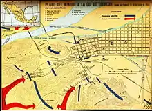 ![]() Plan of the Battle of Torreón with the direction of attack of the revolutionaries (red arrows) and the positions of the federal troops (blue lines) | |||||||