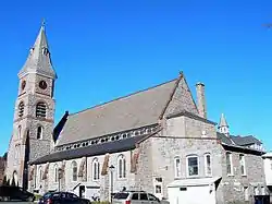 The church is set in the heart of downtown Great Barrington, facing west toward Main Street. The church, along with its manse and carriage house, are all built of locally quarried limestone. The church is two stories in height, with a longitudinal nave whose walls are supported by buttresses. Its roof is steeply pitched, and covered in slate. A five-story tower, 116 feet (35 m) in height, rises at the southwest corner, and is topped by a pyramidal roof with flared edges. The church was built in 1883, using parts of the previous (1859) structure, which was built from stone sourced at the same quarry, and was destroyed by fire in 1882. The church was designed by William C. Brocklesby, an architect practicing in Hartford, Connecticut. The manse and carriage barn, added in 1884, were designed by Peabody and Stearns of Boston.[3]
