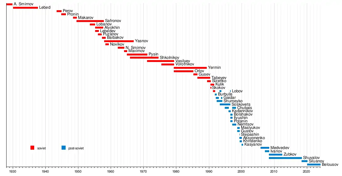 Nikolai Baibakov | 4 May 1957 | 7 May 1958 | Chairman of the USSR State Committee for Planning | Yasnov Kozlov Polyansky |