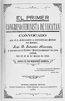 The First Feminist Congress of Yucatán was a gathering of Mexican feminists that happened in 1916. The delegates gathered at the José Peón Contreras Theater in Mérida, Yucatán, Mexico from January 13 to 16. It was held under the auspices of the Yucatecan government. The Mexican government and historians largely consider it the first of its kind in the country.[1] It was the second to be held in all of Latin America and the Caribbean, the first held in Argentina in 1910.[2]