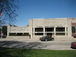The building has undergone at least three renovations. During the 1950s the building was modernized: the biggest change was the lowering of the original skylight to allow installation of air conditioning, but the work also involved covering much of the interior limestone and removing the oak trim. During the 1960s the First National Bank of Dwight, the owners at the time, remodeled the building once again. This remodeling removed Wright's originally designed partition which divided the building into bank and real estate offices. The later renovation also recreated the original skylight, uncovered the interior stone, and utilized the original plans to reincorporate the oak trim.[3] Around 1990 the building was expanded to the left and also added the drive-up canopy. The building addition blends well with Wright's original design.