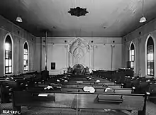 First Presbyterian Church is a historic Presbyterian Church in America congregation in Camden, AL. The church was organised in 1845.[1] Originally known as the Old School Presbyterian Church, its charter members numbered twenty-three. First Ruling Elders were Alexander McLeod and W. Patton.[2] The original church building was burned down in 1868, and a wood sanctuary was erected in the 1880s. The interior walls were decorated with trompe l’oeisle (simulated Gothic apse behind the pulpit) and painted pilasters and medallions until the restoration in the 1950s.[3]