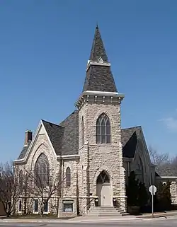 The congregation grew and planning for a new building was begun. Construction on the present Gothic Revival structure began in July 1884. It was designed by Marshalltown, Iowa architect Frank M. Ellis. Stone for the building was hauled in from Stone City, Iowa. The church was dedicated on September 27, 1885. A unique feature of this church building in Iowa is its octagonal shape.[3]