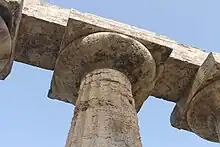Several features of the Temple of Hera I are preserved in remarkable condition. All the peristyle's 50 columns, including the architraves, have survived, some still boasting a floral decorative band beneath the echinus, the round part of a Doric column.[2] The three columns in the pronaos are still in situ, along with the antae (pilasters).[2] However, only the foundations of the external walls of the naos can be seen, as the walls have mostly disappeared, and the frieze has completely vanished.[2]