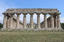 The First Temple of Hera (Paestum)—also known as Temple of Hera I and the Basilica—is an archaic Doric order Greek temple in the ruins of the ancient city of Paestum, Italy.[1][2] This Doric temple is considered one of the oldest Greek temples in Italy and is known for its distinctive architectural features.[3][1] It was built around 550–525 BCE, within a century of the city's establishment by Greek colonists from Sybaris, who named the city Poseidonia.[4][2][3]