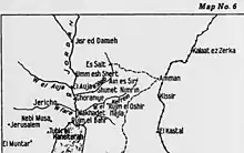 The First Transjordan attack on Amman (known to the British as the First Attack on Amman)[4] and to their enemy as the First Battle of the Jordan[5] took place between 21 March and 2 April 1918, as a consequence of the successful Battle of Tell 'Asur which occurred after the Capture of Jericho in February and the Occupation of the Jordan Valley began, during the Sinai and Palestine Campaign of World War I. During the First Transjordan attack large incursions into Ottoman territory occurred. Firstly the Passage of the Jordan River, was successfully captured between 21 and 23 March, followed by the first occupation of Es Salt in the hills of Moab between 24 and 25 March. The First Battle of Amman took place between 27 and 31 March when the Anzac Mounted Division and the Imperial Camel Corps Brigade (fighting dismounted as infantry) were reinforced by two battalions of 181st Brigade followed by a second two battalions from the 180th Brigade (60th London Division) and artillery. The Fourth Army headquarters located in Amman was strongly garrisoned and during the battle received reinforcements on the Hejaz railway, the strength of which eventually forced the attacking force to retire back to the Jordan Valley between 31 March and 2 April. The Jordan Valley would continue to be occupied by the Egyptian Expeditionary Force (EEF) through the summer until the middle of September 1918 when the Battle of Megiddo began.