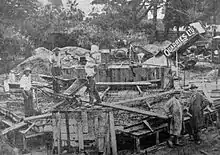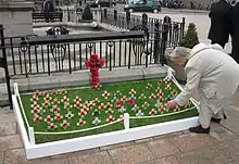 In Britain and Australia, early memorials were closely linked to the need to promote military recruitment and the state had an ambivalent attitude towards the informal memorials that emerged during the conflict. In Britain, stone memorials to the war began to be erected in towns and villages from 1915 onwards; some of these were given out by the state as rewards to communities for meeting military recruitment targets.[36] In Australia, the existing memorials to mark the Boer War were used initially for commemorative ceremonies intended to increase military recruitment.[37] As casualties increased, rolls of honour listing the dead began to be displayed in Britain and honour tablets with the names of those who had enlisted were put up inside Australian buildings: Australia used these lists to apply moral pressure on those who were not yet joined up.[38] Informal memorials began to multiply as the war progressed. Local Australian groups erected small monuments, such as drinking fountains and stone pillars, to the point where the government became concerned about the expenditure on them and passed a law in 1916 to control their numbers.[39] In Britain, some Anglican church leaders began to create street war shrines to the dead. These cheap, local memorials were mainly constructed in working class districts, often built from wood and paper, and were used for holding short services in honour of the dead and to hold donations of flowers.[40] They were criticised, however, as promoting Catholic ritualism.[40] Official support for the shrines only came after a national newspaper campaign, efforts by the Lord Mayor of London and a well-publicised visit from Queen Mary to a shrine, and standardised stone shrines then began to replace the earlier, temporary versions.[41]