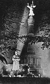 The rise of Fascism in particular frequently encouraged greater state involvement. In Italy, between the end of the war and 1923 local groups and organisations had established their own local memorials in villages and towns.[76] Not all villages agreed that memorials were appropriate, either for political or religious reasons.[77] With the Fascist revolution, this process became more centralised; veteran groups were assimilated by the Fascist government in 1926, and a systematic attempt to construct suitable national and local memorials followed.[77] In Germany, the political and economic chaos of the immediate post-war years discouraged the construction of civic war memorials and comparatively few civic memorials in their larger towns, mainly due to the shortage of funds in the inter-war German economy and political disagreements between local groups as to what to commemorate and how.[78] Those memorials that were constructed were often built instead by local movements, representing particular factional interests.[79] It was only after the rise of the German Nazi party to power in 1933 that substantial funding began to flow into construction programmes, controlled from Berlin.[80]
