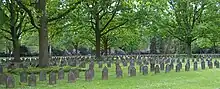 German war cemeteries are somewhat different from French and British ones, being more austere and simple in design.[109] They were built around lawns, without flowers or other decorations, intended to highlight acceptance of the tragedy and avoid the expensive and pretentious sentimentality that the German VDK felt Allied cemeteries invoked.[123] German war cemeteries also included heldenhaine, heroes' groves populated with oak trees and large boulders, dolmen. Both symbolising nature; this landscaping was considered to be particularly important for German war cemeteries.[124] The cemeteries used slate grave markers, less individualised than British or French equivalents, and felt to better symbolise the importance of the German nation as a whole.[125]