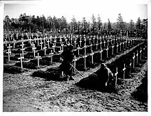 The construction of the French cemeteries was complicated by even more heated arguments over how the bodies of the war dead should be dealt with.[59] During the conflict the French war dead had ended up being split between special war cemeteries, local civilian cemeteries and some had been returned to their original villages.[59] Catholic traditionalists in the government called for the bodies to be buried together in special cemeteries along the Western front, while others campaigned for them to be returned to local cemeteries.[120] In 1919, the decision was taken to use special war cemeteries and to ban the repatriation of bodies, but by 1920 this decision had been reversed and 300,000 French bodies were repatriated to their original homes.[121] The French war cemeteries were typically much larger than their IWGC equivalents and used concrete Catholic crosses for all the graves, with the exception of the Islamic and Chinese war dead.[122]