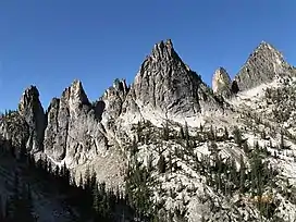 Fishfin Ridge is part of the Bighorn Crags in the Salmon River Mountains which are a subset of the Rocky Mountains.[5] The remote ridge is situated 30 miles west of Salmon, Idaho, in the Frank Church–River of No Return Wilderness. An approach is possible from July through October via a multi-day backpacking trip along trails.[6] Precipitation runoff from the mountain drains to the Salmon River via Clear Creek (north slope) and Wilson Creek (south slope). Topographic relief is modest as the summit rises 1,700 feet (520 meters) above Clear Creek in approximately one mile. This landform's toponym has been officially adopted by the United States Board on Geographic Names,[3] and the highest point is unofficially known as "Knuckle Peak."[1] The first ascent of Knuckle Peak was made by Lincoln Hales and Pete Schoening in 1955.[1] Fishfin Ridge was named in 1962 by Dr. Paul Dilke of University of Idaho because it looks like a dorsal fin of a prehistoric fish.[7]