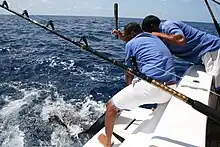 For poles, Maldivian fishermen use a bamboo or plastic construction pole, typically 10 to 15 feet (4.6 m) in length and capable of handling a fish weighing as much as 50 lb (23 kg), with a line and a feathered barb-less hook attached to the smaller end of the pole.[13] The fishermen will go out at the start of a fishing day in their dhoni boats, looking for live bait such as small scads, silver side and sardine, which are kept alive by the specialised fresh seawater circulating system of the dhoni. With bait on board they then go out looking for schools of tuna.[13]