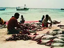 The major fishery in the Maldives is the tuna fishery. The most important tuna species is the skipjack tuna, although they are coming under increasing pressure. Next most important, in terms of fish exports from the Maldives, is the large yellowfin tuna.[9]