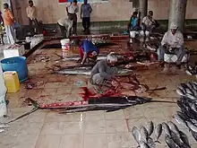 The capital of the Maldives, Malé is known for its busy fish markets.[5] Fish is an integral part of the Maldivian diet and it is a common sight to see office workers in formal white shirts and ties on bicycles after work taking skipjack home to eat.[5] Trolleys packed full of fresh tuna or skipjack are carted around in door to door sales. Tuna however is the most important fish, and in recent years in the Maldives the industry has become more efficient, using tuna waste and residue to be processed into fishmeal, an animal food supplement, further contributing to the economy.[5] The tuna industry in the Maldives has been greatly helped by The State Trading Organisation which rebuilt the efficient tuna cannery plant on the island of Felivaru.[5] The canning process typically takes four days, and the plant has the benefits of modern technology and even a laboratory for research and quality control.[5]