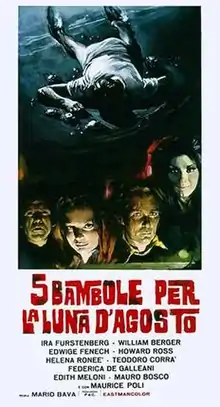 Produzioni Atlas Consorziate purchased Mario di Nardo's script for Five Dolls for an August Moon with plans to make it into a vehicle for actress Edwige Fenech, though early publicity instead spotlighted Princess Ira von Fürstenberg (who was one of the film's principal investors).[1] The film lost its director just days before filming was scheduled to begin, leading producers Mario and Pietro Bregni to appeal to Mario Bava to take over. Though there is no record of who the original director was, Mario Bava biographer Tim Lucas reasons that it was mostly likely Guido Malatesta.[1] Bava was very reluctant to take on the project, since he felt the script was a poorly written ripoff of Agatha Christie's novel And Then There Were None, but agreed to do it under the condition that he be paid up front.[1] He was further dismayed when, at the meeting where he was presented with the contract for the movie, the Bregnis told him that the original director's departure was so last-minute that the cast and technical crew had already been selected and filming was to begin in just two days, leaving him no time to rework the script.[1]