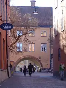 A short cobbled street, Valvgatan, connects the Dombron bridge and Fyristorg with Riddartorget, the open place in front of the stairs leading up to the southern cathedral entrance. A vaulted underpass leads under the historical Skytteanum building, traditionally home to the Skyttean Professor of Eloquence and Government since the 1620s. Other buildings situated in the block between Riddartorget and Drottninggatan include Värmlands nation, Oxenstierna House with the Faculty of Law and Stockholms nation.