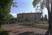 The University Park with the monument to Erik Gustaf Geijer is situated centrally in the neighbourhood, a short distance west of the cathedral. The main building of the university and the park was created in the 19th century on the site of the former Archbishop's Castle and the baroque horse riding courts. University Hall, Gustavianum, the Archbishop's Residence, Södermanlands-Nerikes nation, Smålands nation and the Church of Sweden office building are situated around the park. Other student societies in the area between Sankt Olofsgatan and Skolgatan north of the University Park include Uplands nation, Västmanlands-Dala nation and Kalmar nation.