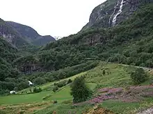 Plans to build a railway to connect Norway's two largest cities, Oslo and Bergen, were launched by Andreas Tanberg Gløersen in 1871. He proposed that the line run via Hallingdal and Voss and include two short branch lines which would connect to the two major fjord systems in the area, Sognefjord and Hardangerfjord. The narrow gauge Voss Line from Bergen to Voss opened in 1883, and the Bergen Line was completed as standard gauge in 1909.[14] During the construction of the Bergen Line, the path that ran up Flåmsdalen was upgraded by NSB to allow access to the area around Myrdal.[15] This road was used by horse carriages and later cars, becoming an important access route to the area, but it was too steep and narrow for heavy vehicles. The Hardanger Line, which connected the Bergen Line to Hardangerfjord, opened in 1935, and was the county's first railway to open with electric traction.[16]