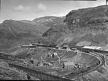 The administration office for the construction was established in 1923 and was until 1935 located at Voss. In that period, construction was led by Peter Bernhard Kristian Lahlum, who was also responsible for the Hardanger Line.[23] After the Hardanger Line was completed, Lahlum retired, and the office was moved to Flåm where responsibility was taken over by Adolph M. B. Kielland.[25] To start with, there were 120 men working on the construction, although this quickly increased to 220. The numbers fluctuated between that and as low as 80, although hit an all-time high of 280 people in 1937. To house the employees, eight barracks were built.[26] Among the first things built were housing and station buildings, which could then be used by people working on the construction.[27] The local economy was stimulated by farmers being paid for transport. Using horses, they would transport tourists by day and building materials by night. The competition was fierce, resulting in fights for customers, although it calmed down after traffic police were introduced.[28]