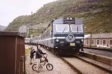 The line is solely served by a tourist-oriented service operated by Vy on behalf of Flåm Utvikling. From May through September, there are nine or ten departures in each direction per day. In the rest of the year, there are four. Fares do not follow the normal fares for Vy and are considerably higher than on other train routes. InterRail tickets are not valid for free travel, but give a 30 percent discount.[55] Travel time varies between 50 and 59 minutes between the end stations.[56] In 2007, the line was the third-most visited tourist attraction in Norway[57] and carried 547,000 passengers in 2010.[58] Between 1998 and 2015, the service is provided by push–pull trains consisting of an El 17 at each end and with B3 carriages.[5][52] The locomotives were built by Henschel in 1987, with electrical equipment from NEBB. They have a power output of 3,000 kilowatts (4,000 hp) and a Bo'Bo' wheel arrangement.[59] Starting in 2014, El 18 replaced the El 17.