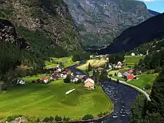 ![]() View of the village of Flåm and the Aurlandsfjorden at the north end of the valley. | |