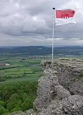 There were more arguments over the flags on Nuremberg Castle. In 2008 a Bavarian flag was hoisted on the castle for the first time. This was taken as an affront by many of the locals. SPD members of parliament demanded that the Free State also displayed the Franconian flag on the castle. This demand was rejected, however, by the Bavarian Interior Minister, Joachim Herrmann.[5] In summer 2009 Lord Mayor Ulrich Maly escalated the flag dispute but allowing the Nuremberg municipal flag to be raised alongside the German and Bavarian flags. Because it is also red and white, the version without the city coat of arms resembles the Franconian flag. Including the requisite additional eight-metre-high flagpole the cost came to €25,000.[6] In summer 2012 the flags were changed again: on the palas, the main building of the castle, the German flag was replaced by a Bavarian flag. On the flagpole where this Bavarian flag had hitherto been hoisted (the Heidenturm tower) a Franconian flag was now displayed. The flag of Germany now fluttered on a pole erected for it in the open.