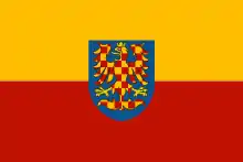 The historian Ivan Štarha argues that Moravia was never awarded the flag.[13] To today's yellow-red bicolour is sometimes added the provincial coat of arms with a red-gold checquered eagle.[19] The red-gold checquered eagle variant was introduced in 2007, and was recommended by some members and supporters of the Moravian National Community to avoid a possible misidentification with other flags, for example the flag of the capital city Prague, which also consists of yellow and red horizontal stripes. This option is criticized by some Bohemian (Czech) nationalist experts.[23][24][25][26]