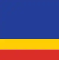 The flag of Ursynów is a divided into 3 horizontal stripes, that are, from the top to bottom, navy blue, yellow, and red. The aspect ratio of the height to the wight of the flag, was described in the establishing resolution as 100:99, although in practice, such proportions aren't used. Instead, the flag is usually given a shape of a wider rectangle, with the proportions equal 5:8. The proportion of the stripes to each other were described as equal 26:7:7, however, those proportion also remain unused in practice. Instead, the flag is usually presented with the blue stripe two times bigger than the remaining two stripes, with the proportion equal 2:1:1.[1][2]