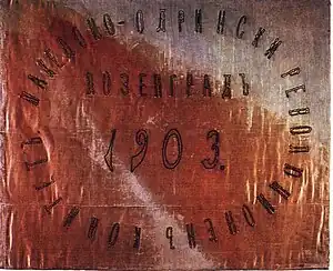 The flag was painted by Georgi Popkirov for the band of Lazar Madzharov. It was sewn by the teachers Rada Boyadzhieva, Nevyana Argirova, Milka Nikolova, Rusia Naydenova and Maria Popstoyanova on the initiative of the head teacher Todor Petkov. On the front is a woman dressed in a pink dress and draped with a gray cloak. In his hand he holds a flag with the motto "Freedom or Death", and next to it is written the verse "He who falls fighting for freedom, he does not die". On the reverse is painted the inscription "Macedonian Revolutionary Organization" and a skull with bones. The flag was burned before the uprising to avoid capture. After the beginning of the uprising, Lazar Madzharov used another flag made of orange silk fabric. The text "Lozengrad 1903" is embroidered on its front, and "Macedonian-Adrianople Revolutionary Committee" in the semicircle. On the reverse is the motto "Freedom or death" and "Dare, people, God is with you!". The flag was preserved and handed over to the Plovdiv Historical Museum, and in 1943 to the National Military museum in Sofia.[2]