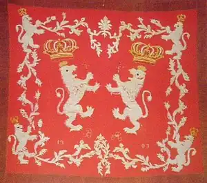 The flag from the Ilinden Uprising of the village of Ranci, brought to Lesok by Angel Boyarovski and handed over to the Museum of Macedonia in Skopje. It is made of red cotton fabric, embroidered on one side with white and yellow threads and measuring 71 x 65 cm. In the center are two white lions erect and crowned, surrounded by a floral border of white, and below them are the letters "B" and "A" and the year 1903. In the four corners are four smaller lions, and on all sides the flag is draped from another red ribbon measuring 5 cm. According to some researchers, it is a wedding flag, not a revolutionary flag.[9]