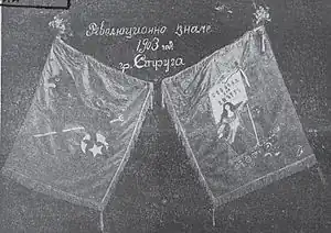 It was sewn by the teachers Fotinka Petrova, Vasilka Stefanova-Pophristova, Aneta Spirova Olcheva, Aspasia Dimova Yakimova, Vasilka Poppetrova-Naranzhova, Vasilka Lazeva Lazheva, Paraskeva Aceva and others, according to a project by the students from Bitola High School Dragan Zografov and Arseni Yovkov. The inscriptions "Freedom or Death" and "Second Mac. Adr. Rev. Reg.: Bitola, Prilep, Lerin, Kostura, Krushovo, Kichevo, Debar, Demir-Hisar" are embroidered on it. On the reverse, on a red background, is written "Dare, people. God is with us", as well as a Christian cross.[2] After the uprising, the flag was brought to Bulgaria, and in 1907 Boris Sarafov was buried with it.[4]