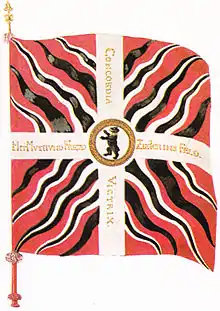 Flammé (German geflammt) is a term in vexillology for a flag design that places a coat of arms in the center of the flag, filling the remaining space on the flag with flame-like designs. The design was used specifically in the Old Swiss Confederacy during the 17th and 18th centuries, where there was no difference between coat of arms and flags, and the same design was used for both. Regiments of Swiss mercenaries during the 18th century, especially those in French service, often used flammé designs with the Swiss Cross superimposed rather than a coat of arms.