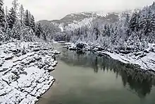The Flathead River rises in forks in the Rocky Mountains of northwestern Montana. The largest tributary is the North Fork, which runs from the Canadian province of British Columbia southwards. The North Fork is sometimes considered the main stem of the Flathead River.[8][9] Near West Glacier the North Fork combines with the Middle Fork to form the main Flathead River.[3] The river then flows westwards to join the South Fork and cuts between the Whitefish Range and Swan Range via Bad Rock Canyon. All of the headwaters forks are entirely or in part designated National Wild and Scenic Rivers. After the river leaves the canyon it flows into the broad Flathead Valley and arcs southwest, passing Columbia Falls and Kalispell, before it is joined by the Stillwater River and its Whitefish River tributary, and then empties into Flathead Lake, where the Swan River joins.[3][10]