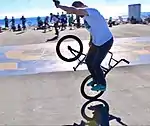 - Miami Hopper: The rider stands on the pedals and grasps the seat tip in right hand, and the front brake lever in left hand. The rider quickly applies the front brake and simultaneously rotates the handlebars 90 degrees counterclockwise towards the seat and pulls up sharply on the seat. This will cause the rear of the bike to rise up and seemingly flip over the front. If landed correctly, the front wheel will lay parallel to the ground and the right handlebar grip will be balancing on the ground leaving the rider perched above the rear wheel. From this position, the rider can make various poses, kick the bike out to the side and lay it down, or lean back sharply and reverse the trick and ride away. Note: The hands and handlebar directions would be reversed if the bike was set up with the front brake lever on the right hand side. (Uncommon set up)