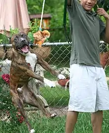 The flirt pole is used to condition dog for running and jumping. Dogs have a natural prey drive that compels them chase after and kill prey, typically smaller animals.[2] In dog training, the prey drive can be used as an advantage because dogs with strong prey drive are also willing to pursue moving objects such as toys, thus encouraging the dog to move or act in a particular way.
