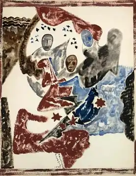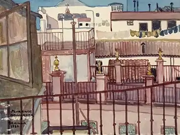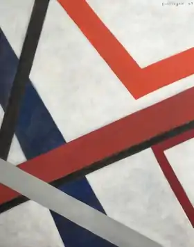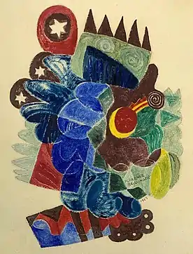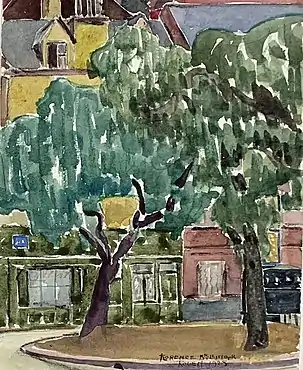 Brillinger's style can be seen in images of representative paintings from the 1920s through the 1960s. She usually painted in oil or watercolor on paper. Early in her career, she made cityscapes and landscapes.[16] During the late 1930s, she painted in a gestural and anthropomorphic abstract style which was said to be influenced by her socialist beliefs.[26] Beginning in 1940, she made geometric abstractions.[27] The watercolors of street scenes in Rouen (1925) and Seville (1932), images nos. 2 and 3 above, are representative of her cityscape watercolors. Two paintings of 1939, one an untitled abstract and the other an abstract called "Stars", image nos. 4 and 5 above, are representative of her gestural abstractions of the late 1930s. The painting called "Red and Blue" of 1963, image no. 7 above, is representative of her late style of geometric abstraction.