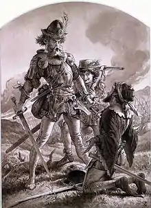 Another possible source is an Elizabethan era Welsh soldier of fortune Roger Williams. A national hero in the wars against Spain, he would certainly have been known to audiences at the time the play was written and performed. Williams, who died in 1595, was a close ally of the Earl of Essex, and had been given a large public funeral in St Paul's cathedral four years before the play was written. Julian S. Corbett wrote that Williams "with his professional pedantry, his quaint and forcible turns of speech, his vanity and cool valour, was another 'Fluellen'.".[5] Shakespeare scholar J. Dover Wilson suggested that Fluellen was intended as "a careful and unmistakable portrait—a real portrait—of Sir Roger Williams, the Welsh soldier who had accompanied Essex during the French campaign of 1592 and had died, tended by Essex to the last, in 1595." He went on to claim that this was evidence that the play promoted the Essex's 1599 expedition to Ireland, to which the Chorus specifically refers: "That this old friend [of the Earl] should reappear in a stage-representation of Agincourt four years later is strong evidence that the play was intended to be associated with the hope of England."[6]