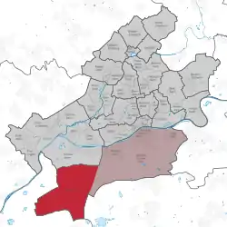 Location of Flughafen (red) and the Ortsbezirk Süd (light red) within Frankfurt am Main | |