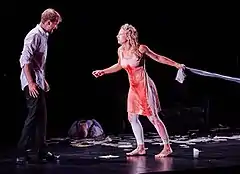 The company's acclaimed production Hamlet, who's there? began as an exploration of the divided self and the transference of grief originally intended for audiences who had suffered trauma. It premiered at the Gdańsk Shakespeare Festival on 4 August 2015 and is produced in conjunction with English Touring Theatre;[5] it features Kelly Hunter as Gertrude and Greg Hicks as Claudius[6] in an intimate and contemporary production[7] which condenses the action of Hamlet into one evening in a 90-minute play featuring just six actors.[3][8] Adapted from the original by Hunter, in 2016 the play was performed during an international tour[9] which included the Mercury Theatre, Colchester, the International Shakespeare Festival in Craiova, the Park Theatre in London, Clasicos en Alcala in Spain, the Globe Neuss in Germany and Elsinore Castle.[10][11] The script is published by Bloomsbury Publishing and is available from Samuel French.[12]