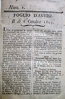 Foglio d'Avvisi was the first newspaper in the British protectorate of Malta,[1] being published between 1803 and 1804.[2] At the time of its issue, it was the only periodical publication in Malta. Foglio d'Avvisi was preceded by the Journal de Malte (1798) during the French occupation of Malta and it was succeeded by L'Argo (1804).[3]