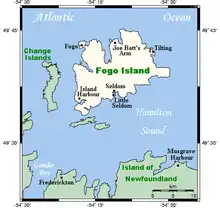 Fogo Island (Fogo, Portuguese for "Fire") is the largest of the offshore islands of Newfoundland and Labrador, Canada. The Town of Fogo Island encompasses Fogo, Joe Batt's Arm-Barr'd Islands-Shoal Bay, Seldom-Little Seldom and Tilting, with the unincorporated areas of Fogo Island.[2] It lies off the northeast coast of Newfoundland, northwest of Musgrave Harbour across Hamilton Sound, just east of the Change Islands. The island is about 25 km (16 mi) long and 14 km (8.7 mi) wide. The total area is 237.71 km2 (91.78 sq mi).