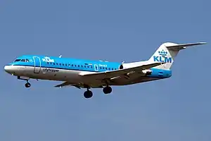 The vast majority of Fokker 70s were delivered to various operators in the European market. One early customer for the Fokker 70 was the Dutch flag carrier KLM, who opted to replace its remaining Fokker F28s with the type.[13] The company's regional airline subsidiary KLM Cityhopper operated the Fokker 70 for numerous years; on 28 October 2017, the final flight of a KLM Fokker 70 was conducted.[14] The Italian flag carrier Alitalia at one point had 15 Fokker 70s on order via leasing agreements for its subsidiary Avianova; on 20 December 1995, the first example was put into revenue service.[15] However, its operations of the type would be relatively brief; by February 1997, the company had decided to return its fleet.[16] On 30 October 1995, the French flag carrier Air France introduced its first Fokker 70, typically using it as a replacement for its ATR 42s.[17]