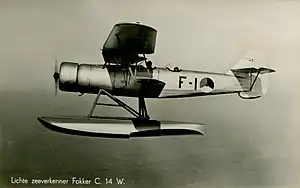 The Fokker CXIV-W was a reconnaissance seaplane produced in the Netherlands in the 1930s. It was a conventional, single-bay biplane with staggered wings of unequal span braced by N-struts. The pilot and observer sat in tandem, open cockpits, and the undercarriage consisted of twin pontoons. 11 of the 24 examples produced were stationed in the Dutch East Indies. These were later joined by 12 aircraft that had escaped to the UK following the German invasion of the Netherlands in 1940. All C.XIVs were destroyed during the Japanese invasion of the Dutch East Indies.